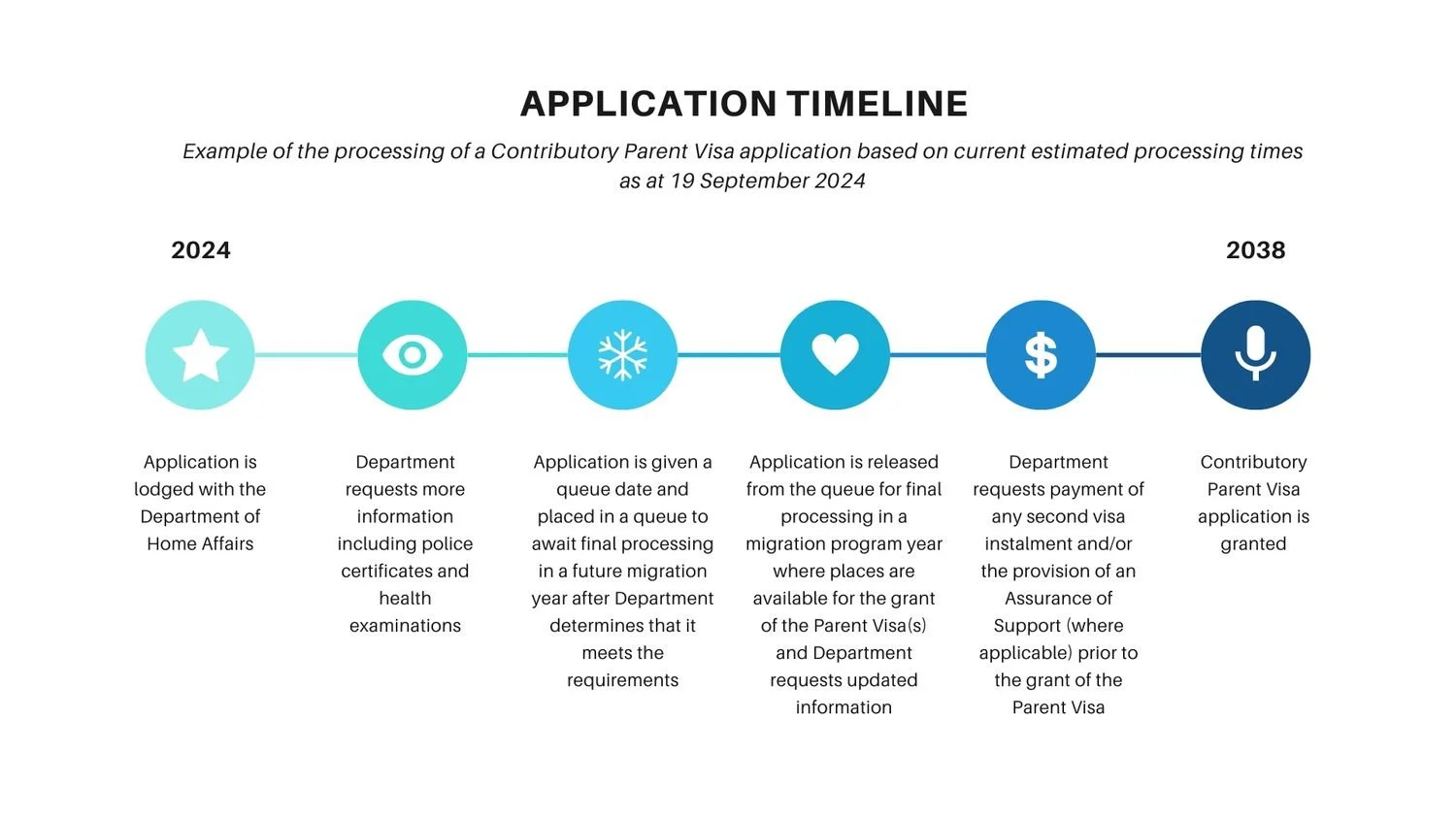 It is important to note that new Parent Visa applications can currently take anywhere from 14 years to 31 years to be finalised by the Department, due to the capping and queuing arrangements which Parent Visa applications are subject to.