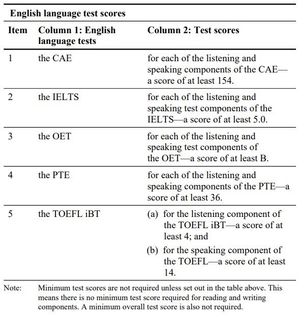 *NOTE: The Explanatory Statement for the Migration (English Language Requirements for Subclass 192 (Pacific Engagement) Visa) Instrument (LIN 24/023) 2024 which sets out the minimum English language requirements states that “[a]pplicants who can demonstrate English language proficiency, for instance through time spent working or studying in an English speaking country or by previously satisfying an approved English language test, will not be required to satisfy the English language test requirements specified in the instrument”, and that “[a]pplicants who do not meet these circumstances will have the option of undertaking to participate free of charge in the Australian Migrant English Program”. However, the Migration (English Language Requirements for Subclass 192 (Pacific Engagement) Visa) Instrument (LIN 24/023) 2024 does not actually prescribe any exceptions to the English language test result requirements, which means there is no actual legal basis to allow exemptions to the below requirements: